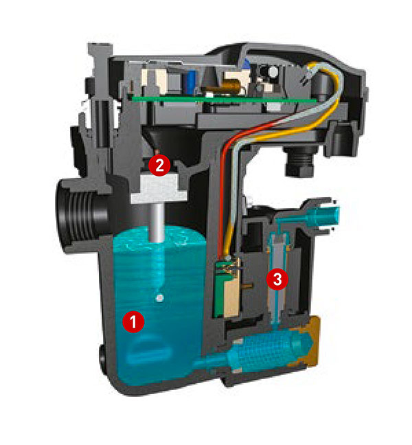 Condensul lichid se acumuleaza intr-un spatiu din interiorul carcasei purjei (1), un senzor capacitiv (2) monitorizeaza permanent nivelul de umplere.Cand se atinge nivelul maxim de condens, senzorul da comanda de deschidere a electrovalvei (3).