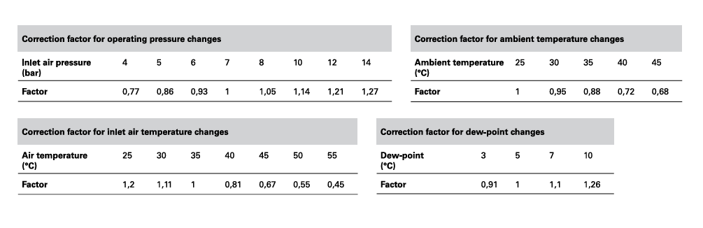 Factorii de corectie se aplica in functie de presiunea de lucru, temperatura ambientala, temperatura aerului de intrare si modificari ale punctului de roua